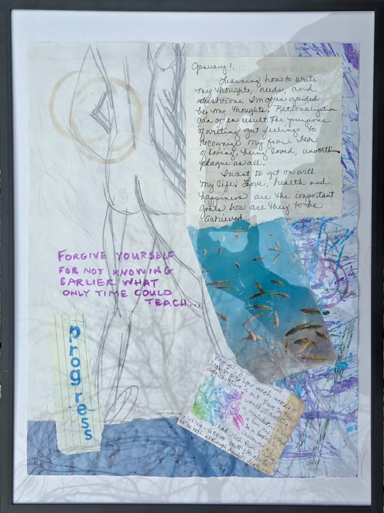 The collage layers journal fragments, cosmic doodles, and unapologetically messy textures—a love letter to progress, not perfection.